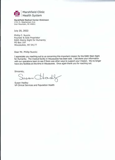 We received response letters from The Marshfield Clinic in Iron Mountain, Michigan and from Bellin Health. I will attempt to post these letters in the photo section of this page. I have started the follow up letters from the last batch of invitations sent to head of staff of various Hospitals. Still having problems with Sherri's last import files