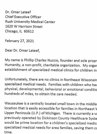 4/21/2022 ...I had a converation this afternoon with Mr. Scott Wilkerson, Senior Vice President and Development Officer of the Ann & Robert Lurie Childrens Hospital in Chicago. The bottom line is that they are unable to meet our needs. But Mr. Wilkerson provided me with his knowledge in a great number areas which I can use in the future.